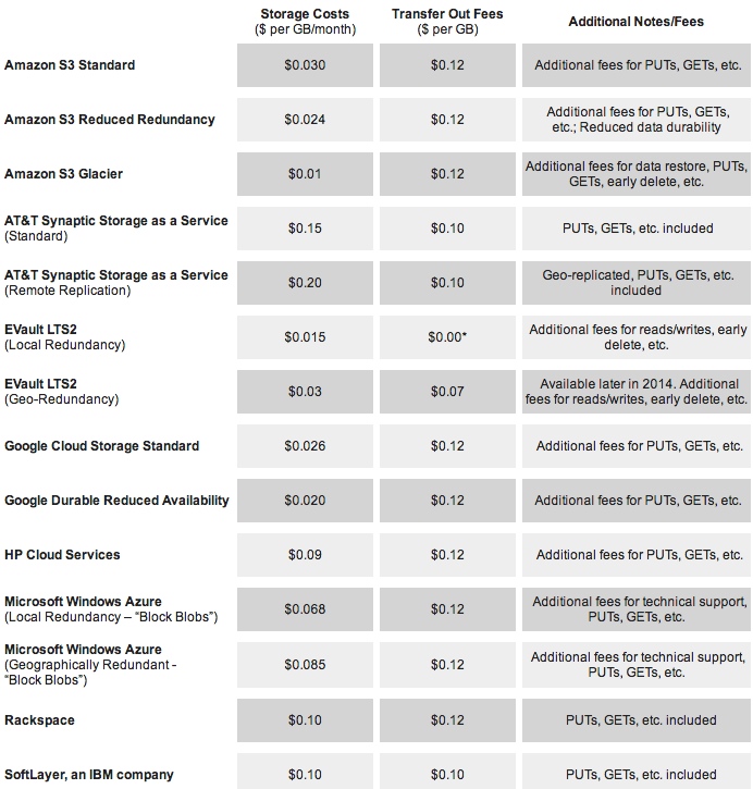 This comparison includes pricing for Amazon S3 Standard, Amazon S3 Reduced Redundancy, Amazon Glacier, AT&T Synaptic Storage as a Service, EVault LTS2, Google cloud Storage, Google Durable Reduced Availability (DRA) Storage, IBM SoftLayer, HP Cloud Services, Microsoft Azure and Rackspace.
