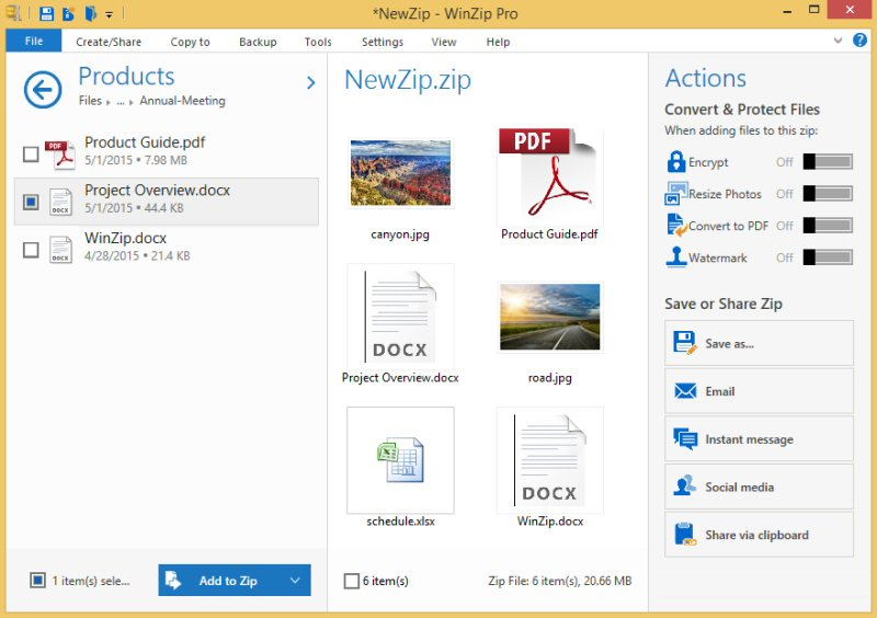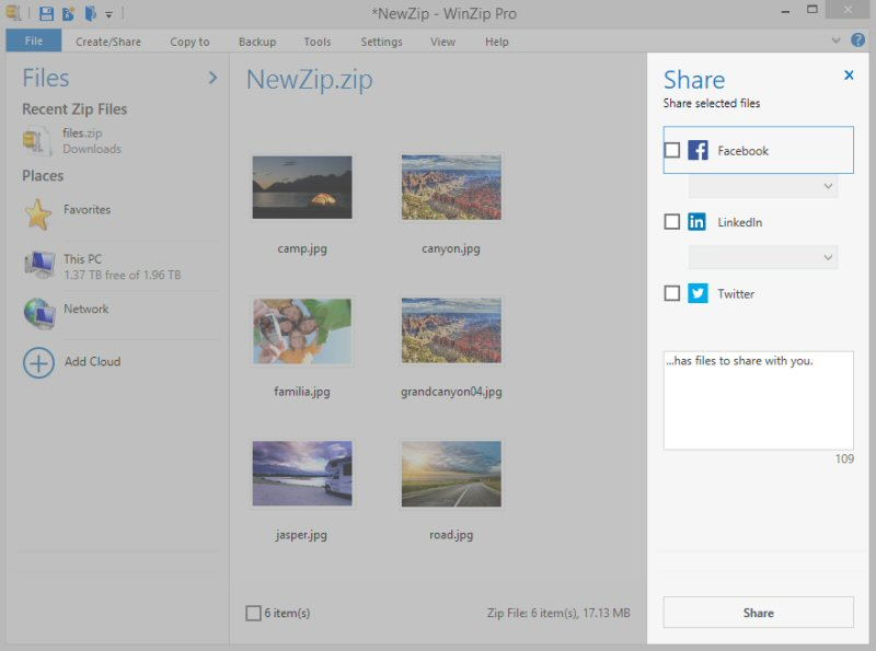 SmartShare: Select a file from your computer, cloud service or a zip, then choose a destination-social media, instant messaging (IM) or email. WinZip lets you share your files zipped or unzipped through your favorite services.