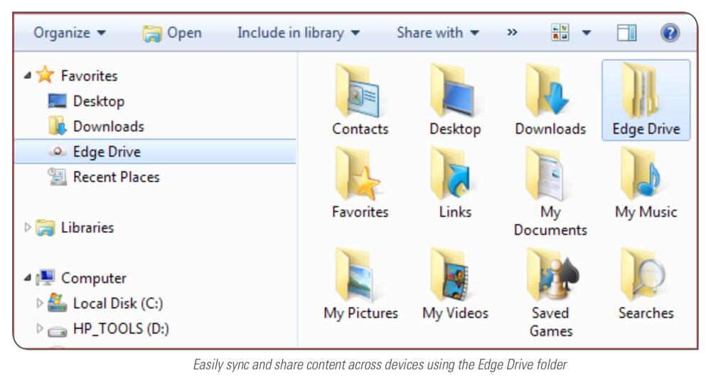 Seamless sharing of files and folders from the Edge Drive folder with other users via the web or mobile app.