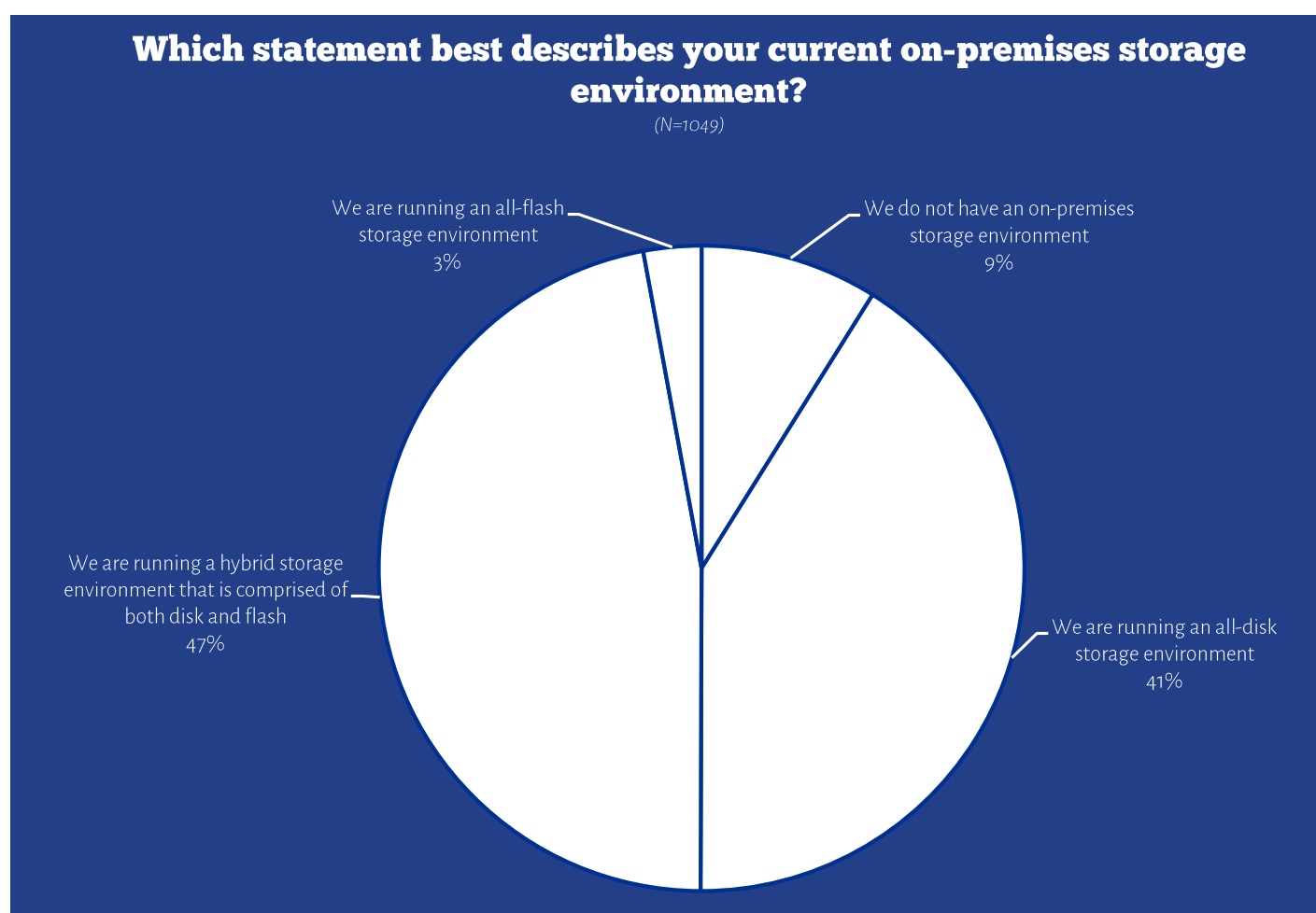 - 23% of respondents use some kind of all-flash array, while only 3% run their entire storage environment using all-flash.