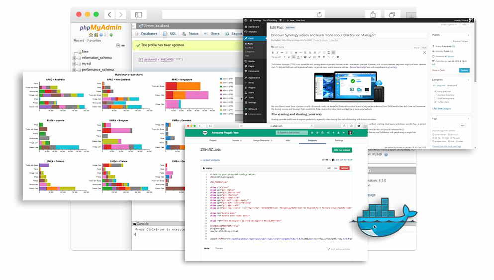 Virtualization for flexible resource allocation: The Virtual DSM (beta) and Docker DSM (beta) packages enable businesses to run multiple instances of DSM on a single NAS, allowing them to consolidate multiple physical servers and build a reliable, flexible, and multi-tenant environment.