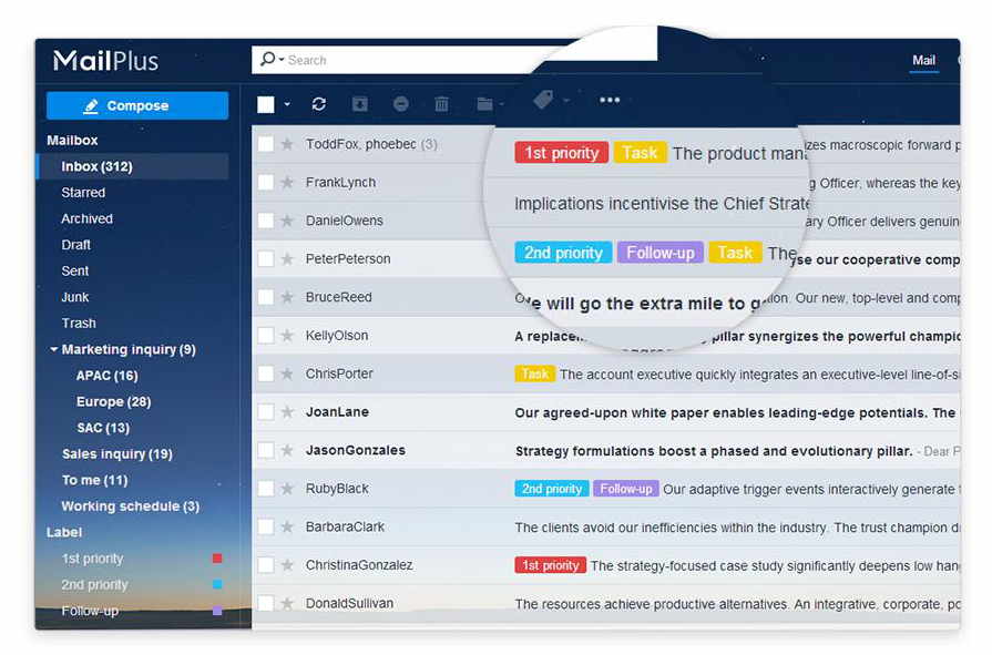 Secure and intuitive mail solution: The MailPlus and MailPlus Server (beta) packages allow your business to set up a secure, private mail server featuring active-active design for HA and load balancing, and at the same time give your employees a modern mail client for receiving, sending, and organizing messages with labels, separate inboxes, and filters.