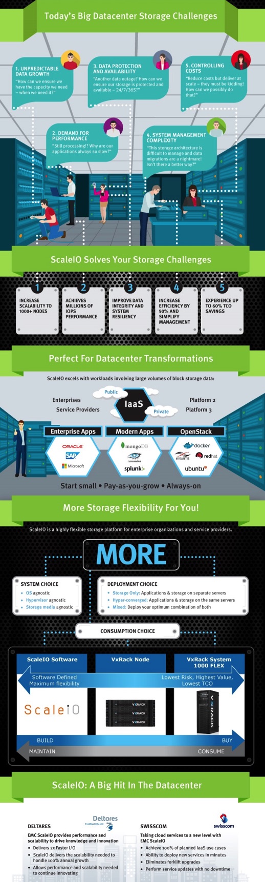 - IaaS for traditional environments: ScaleIO is applicable to most block use cases but ScaleIO’s value resonates highly in private cloud due to its ability to start small and enable pay-as-you-grow, always-on functionality, customer choice, and multi-tenant support.