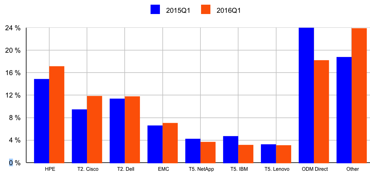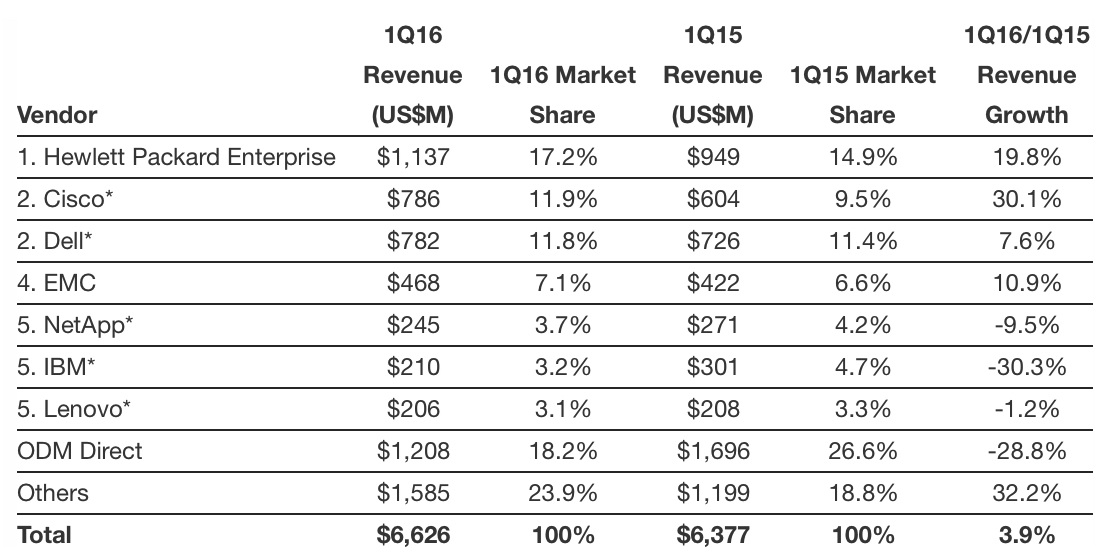 * Cisco and Dell finished 1Q16 in a statistical tie for the number two position, while NetApp, IBM, and Lenovo similarly tied for the number five position in 1Q16. IDC declares a statistical tie in the worldwide cloud IT infrastructure market when there is less than 1e% difference in the revenue share of two or more vendors.