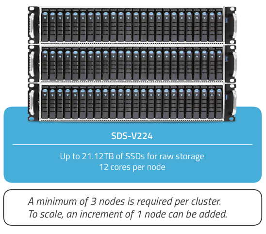 The solution from AIC comes in two versions (registration required for datasheet), both supporting twelve processor cores. The SDS-V110 is available with 64 and 128GB RAM options, while the SDS-V224 comes in 64, 128 and 256GB RAM options. End users get ten hot-swap drive bays in the SDS-V110 and 24 bays in the SDS-V224. Raw storage ranges from 720GB to 5.76TB in the SDS-V100 and climbs to 2.64 to 21.12TB in the SDS-V224.