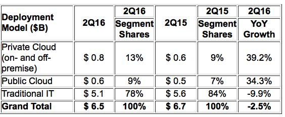 Looking at the market in euros, EMEA reported strong Y/Y user value growth (34.2%) in 2Q16 in public and private cloud across servers, storage, and switches.