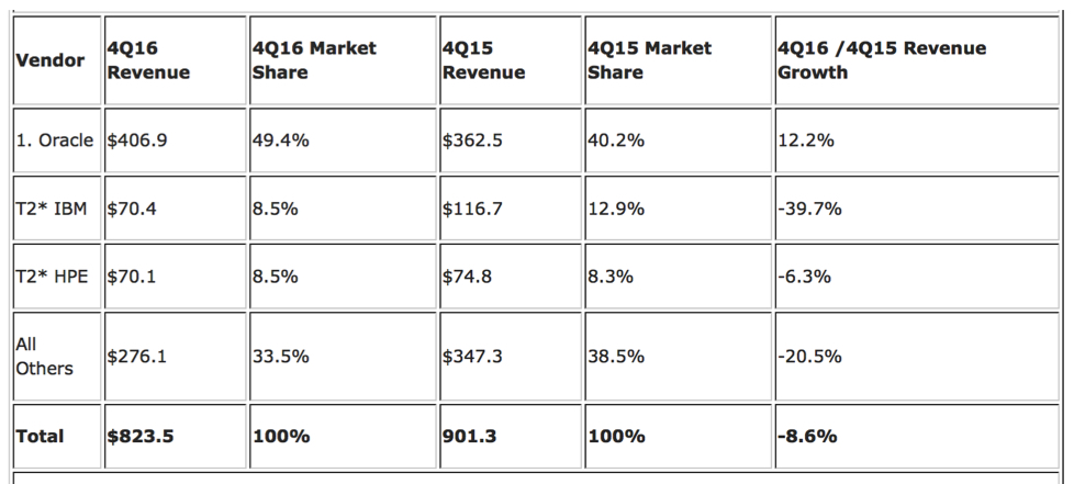 Integrated Platform sales declined 8.6% year over year during 4Q16, generating $823.5 million worth of sales. This amounted to 26.6% of the total market revenue. Oracle was the top-ranked supplier of Integrated Platforms during the quarter, generating revenues of $406.9 million and capturing a 49.4% share of the market segment.