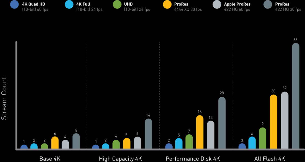 StorNext Performance Disk 4K – The starting point when higher stream counts and capacity are required, supports up to 28 streams of compressed and up to five streams of full-aperture 10-bit uncompressed 4K.