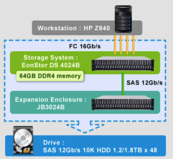 EonStor DS 4024B recently topped the SPC-2 Price-Performance with a record-setting ratio of $6.80. Its performance of 11,000MB/s sequential read throughput and 5,500MB/s sequential write throughput, and high capacity support up to 800TB with expansion enclosures make it a storage choice for high-resolution video creation and post-production.