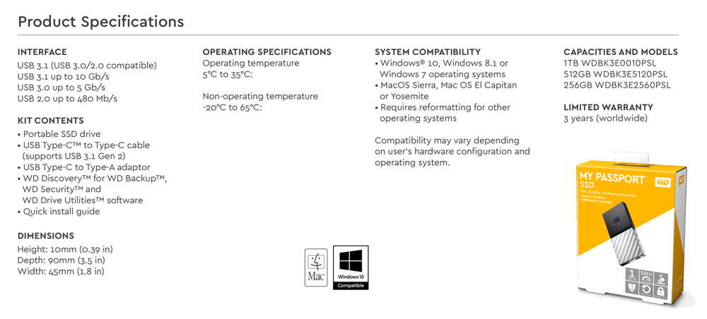 Featuring speeds of up to 515 MB/s (*), the My Passport SSD is the fastest My Passport drive offered by the company’s brand. This drive is designed for the latest generation of computers with a USB Type-C port and is USB 3.1 Gen 2 (10Gb/s) ready with a USB Type-C to Type-C cable and an adapter to use with the more traditional USB Type-A ports found on many computers. Built for PC and compatible with Mac, it offers 256-bit AES hardware encryption and password protection, and is also 6.5-foot drop tested for shock-resistance to withstand 1500G of force.