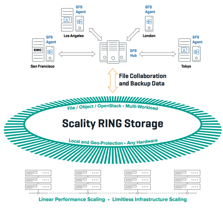 The combined solution features two software-based products, Peer Global File Service (PeerGFS) and Scality RING, working in concert to integrate distributed file and object storage architectures for backup and file collaboration use cases. PeerGFS deploys a distributed file system that enables file sharing with file locking to prevent version conflicts, as well as centralized backup by replicating data in real-time across both local storage at physical sites and to RING, which serves as a shared file system repository.