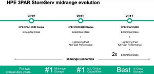 For midrange customers hitting performance limits of aging systems, 3PAR is redefining expectations with the 3PAR StoreServ 9450, a scalable, multi-tenant, and performance all-flash platform that builds on the product family’s number one position in the midrange FC. (2) To enable the consolidation of more data in less space without compromising service levels, the firm is increasing performance 70%, doubling scale to 6PB, and enabling 3X the front-end connectivity with 80 host ports.(3) This member of the 3PAR family enables consistent and predictable performance at less than half the cost of EMC VMAX 250F (4) and supports consolidation of both block and file workloads. For those considering long-term investment strategies, the StoreServ 9450 provides a futureproof path to next generation storage class memory and NVMe using 3PAR 3D Cache.