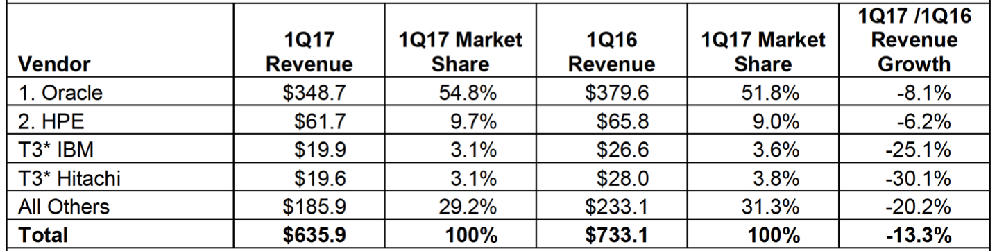 Integrated platform sales declined 13.3% year over year during the first quarter of 2017, generating $635.9 million worth of sales. This amounted to 23.8% of the total market revenue. Oracle was the top-ranked supplier of integrated platforms during the quarter, generating revenues of $348.7 million and capturing a 54.8% share of the market segment.