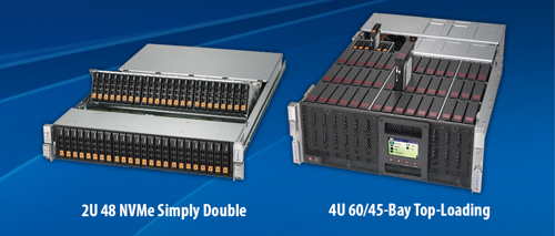 SuperStorage solutions including ‘capacity maximized’ 45 and 60-bay 4U systems, performance and capacity optimized 2U simply double systems, versatile and flexible 1U/2U/3U/4U general-purpose storage systems and 2U storage bridge bay solutions for mission-critical applications. Storage systems are configurable for up to dual Xeon Scalable processors (up to 28 cores, 205W TDP per CPU), 24 DIMMs for up to 3TB of DDR4-2666MHz Reg. ECC memory, up to 48 hot-swap NVMe or SAS3 drives (via HW RAID or IT mode), 40 dual-port NVMe drives, up to six PCIe 3.0 expansion slots and support for SIOM networking module for 100/40/25/10/1GbE, or Omni-Path options and redundant Titanium Level (96%+) digital power supplies.