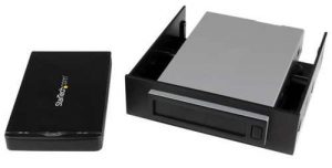 “The drive bay and spare drive enclosure allow users to install a 2.5″ SATA SSD/HDD into a computer or server chassis using a standard 3.5/5.25″ bay. This product combines the benefits of a portable enclosure with a fixed mobile backplane, enabling users to hot swap, replace, or transport a drive with the portable enclosure, or to store their drive in a fixed location, such as in a desktop computer or server,” said Scott Burton, product manager, StarTech.com.