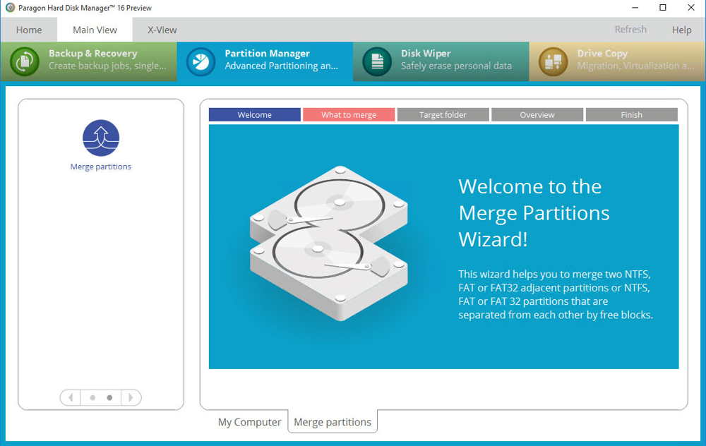 Direct control over partitioning: Move and resize partitions via drag and drop in ‘My Computer’ disk map view or launch specific tasks via dialog: