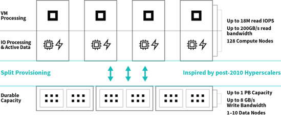 DVX with Split Provisioning is a server-powered converged infrastructure system to separate scaling of host storage speed and persistent capacity to simply and incrementally match resources to evolving tenant requirements. The software provides scaling from 1-128 compute nodes, or up to 200GB/s IO bandwidth, and from 1-10 data nodes, or up to 1.7PB of capacity, in a single composable pool.