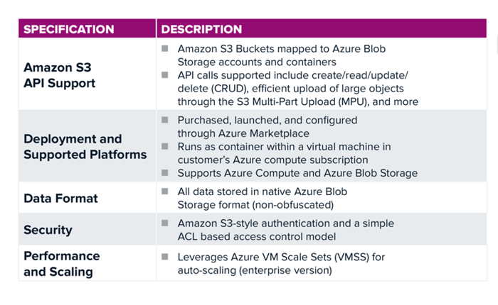 Connect for Azure Blob Storage automatically translates Amazon S3 API calls to Azure Blob Storage API calls, enabling customers to immediately consume Azure Blob Storage with their Amazon S3 applications. It stores data in Azure native format so customers can access that data with Azure cloud services such as Azure Machine Learning or Microsoft Power BI toolsets.