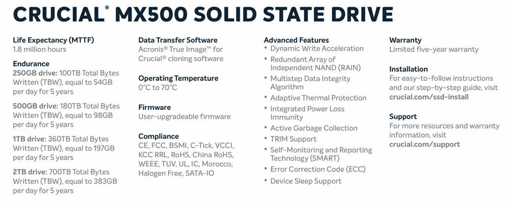 The company’s SSDs have been established, proven, and tested for over seven generations of drives. The MX500 is backed by a five-year limited warranty (3) and supported by the firm’s Storage Executive software tool for drive maintenance.