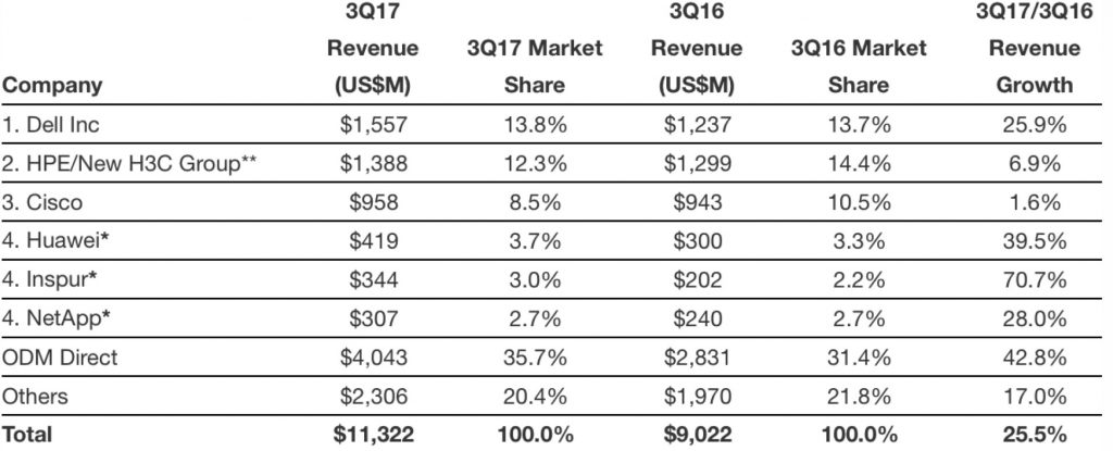 Top vendors: Dell, HE/New HC3 Group, Cisco, Huawei, Lenovo, IBM and NetApp