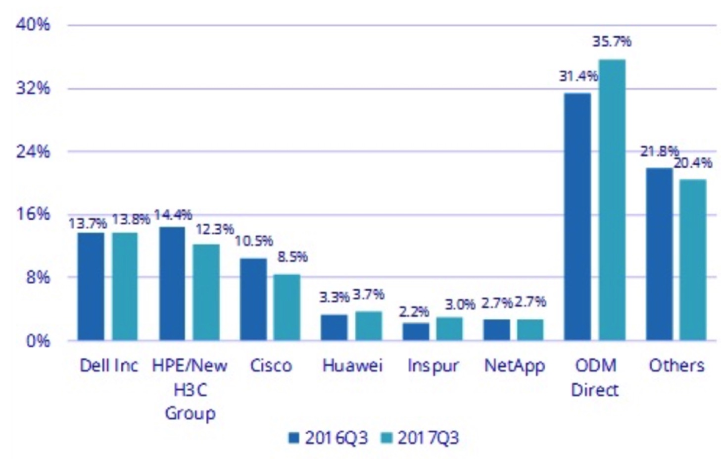 Leaders in order: HPE, Dell, Cisco, EMC, Lenovo, NetApp, IBM, Huawei, Inspur