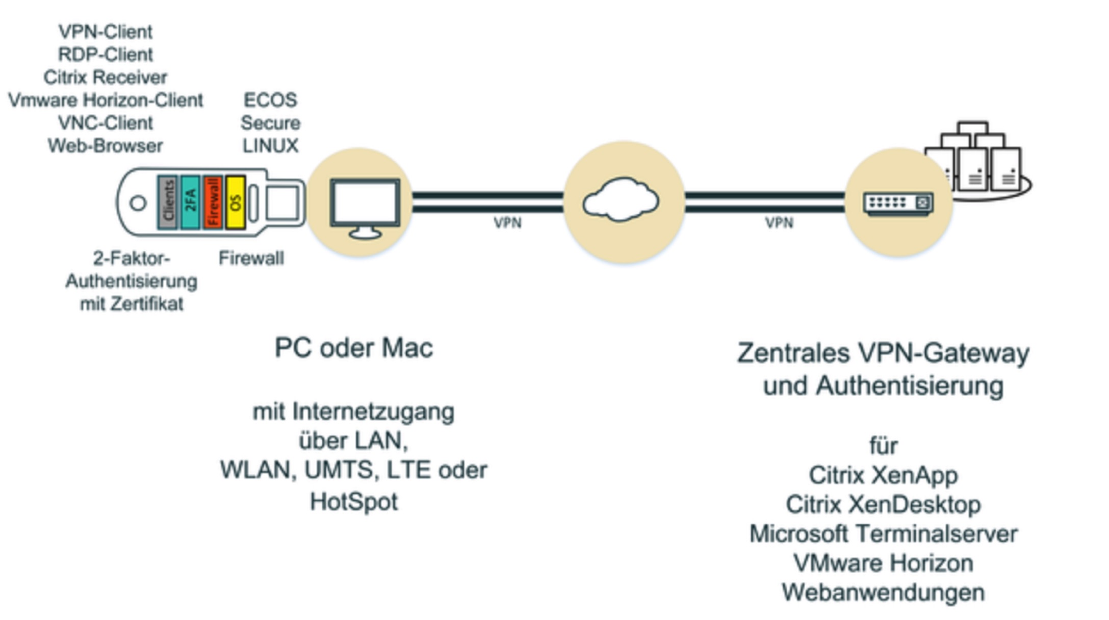 Als erstes ECOS-Produkt überhaupt ist er nach den strengen BSI-Kriterien für die Geheimhaltungsstufe VS-NfD zugelassen Selbst von privat genutzten, potenziell unsicheren PCs und Notebooks ist damit ein vollständig geschützter Zugriff auf sensible Daten möglich. Die Lösung eignet sich dadurch optimal für unterschiedlichste Einsatzszenarien im Bereich mobiles Arbeiten und Home Office.