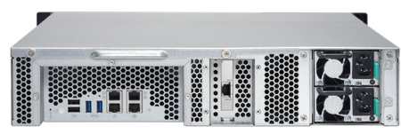 4, 8, and 12 bays with AES-NI encryption engine, hot-swappable 2.5"/3.5" 6Gb SATA HDDs/SSDs, one 10GBASE-T RJ-45 LAN port, 4 Gigabit LAN ports, 2 USB 3.0 ports, and 2 USB 2.0 ports