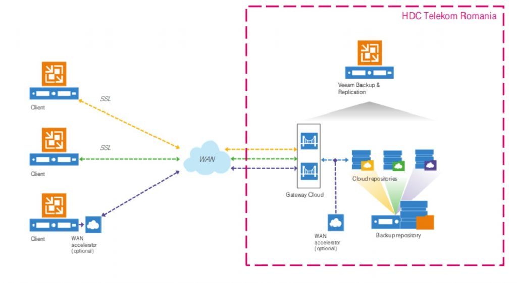Telekom Cloud Backup solution was created based on Veeam Cloud Connect technology and covers a range of backup scenarios for companies, aiming to protect both workstations (PC, laptop), and servers with Linux or Windows operation systems. The data is automatically stored on a backup platform implemented in Telekom Romania’s secure datacenters, located in Romania, where each client has a dedicated storage space.