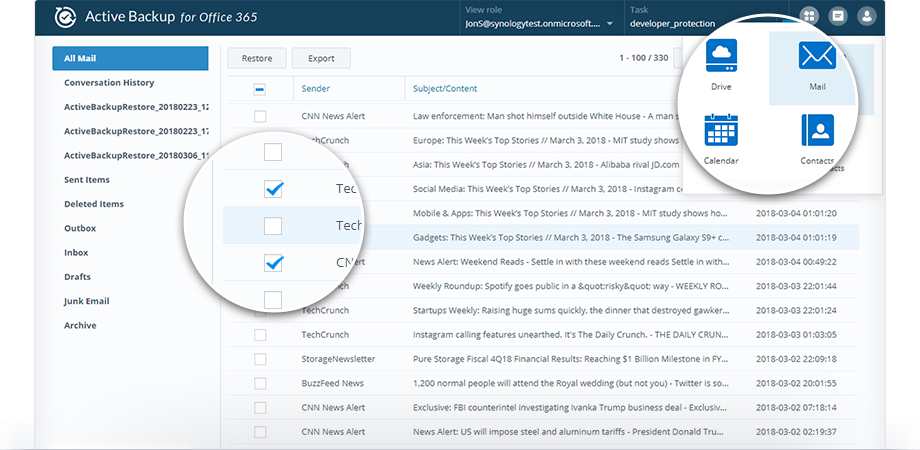 • Centralized and comprehensive protection: backup OneDrive for Business, mail, contacts, and calendar data to a company’s NAS and manage the copies from a single interface.