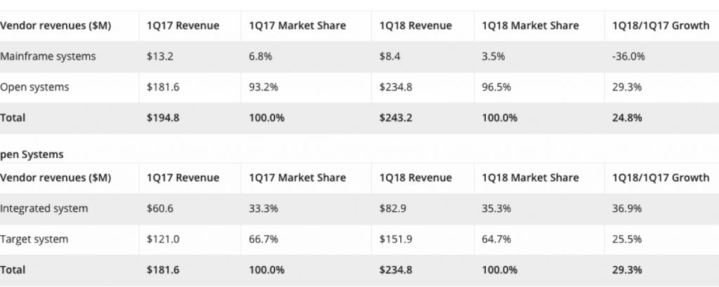 Total EMEA PBBA open systems vendor revenue increased 29.3% year on year, with revenues of $234.8 million. Mainframe system sales decreased 36% year on year in 1Q18.