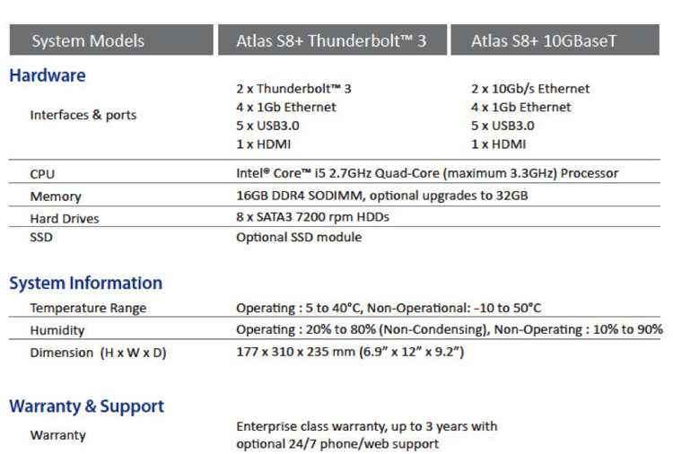 The Atlas S8+ features a fast processor, fast interface, multiple capacity options and a simple GUI, making it to store, access, share and backup rich media content or large databases. Optional cards allow Thunderbolt 3 or 10G connectivity based on the ecosystem with iSCSI support for Windows/Linux.