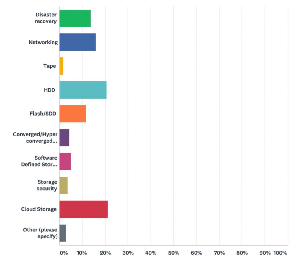• HDD and cloud storage purchases shared the top slot at 21% each. DR and flash/SSD came in at 14% and 12% respectively.