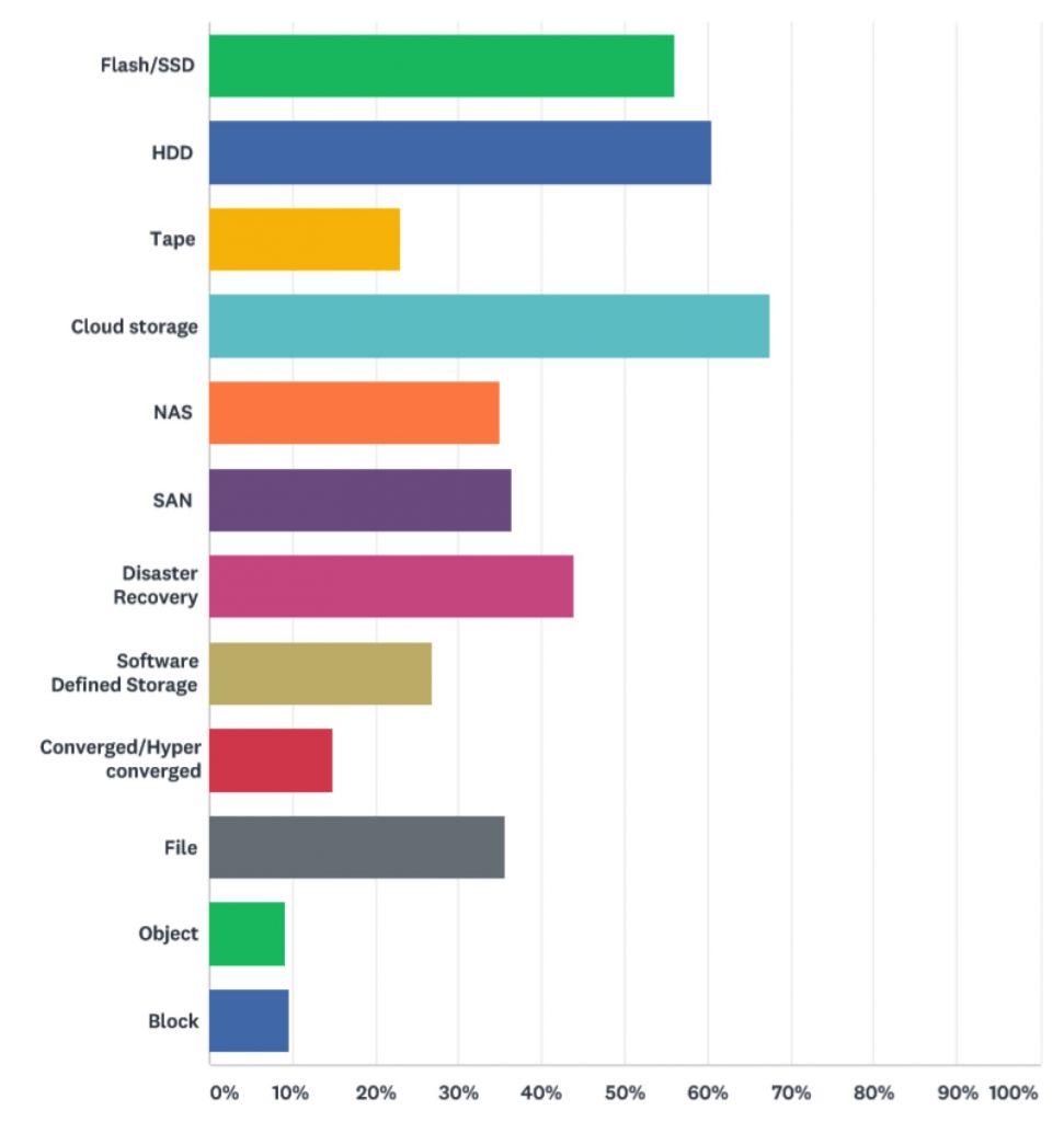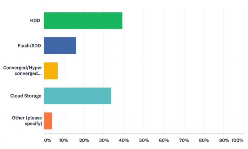 • Respondents reported their primary storage media: HDD and flash/SSD, followed next by cloud storage and then tape. Many respondents own NAS and/or SAN.