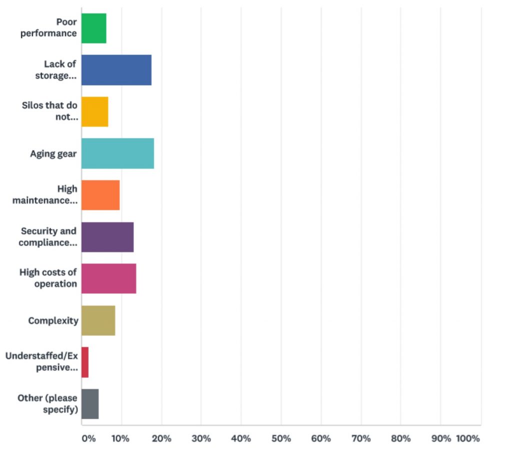 • Respondents reported several leading challenges for managing and optimizing their storage environment. At the top was aging gear at 18% followed closely by lack of storage capacity at 17%, and high costs of operation and security/compliance issues at 13%.