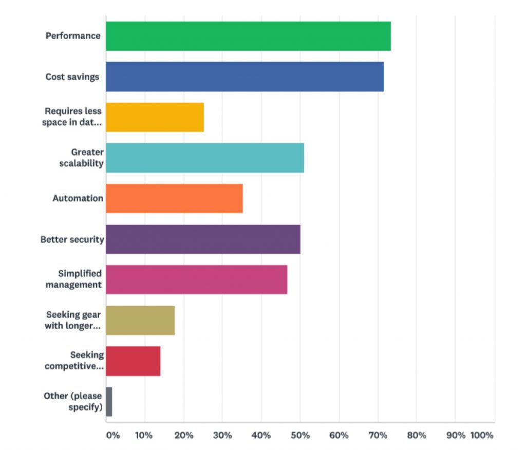 • Cost savings came in just slightly behind performance at 72%. Greater scalability is also important at 51%, better security at 50%, and automation at 35%.