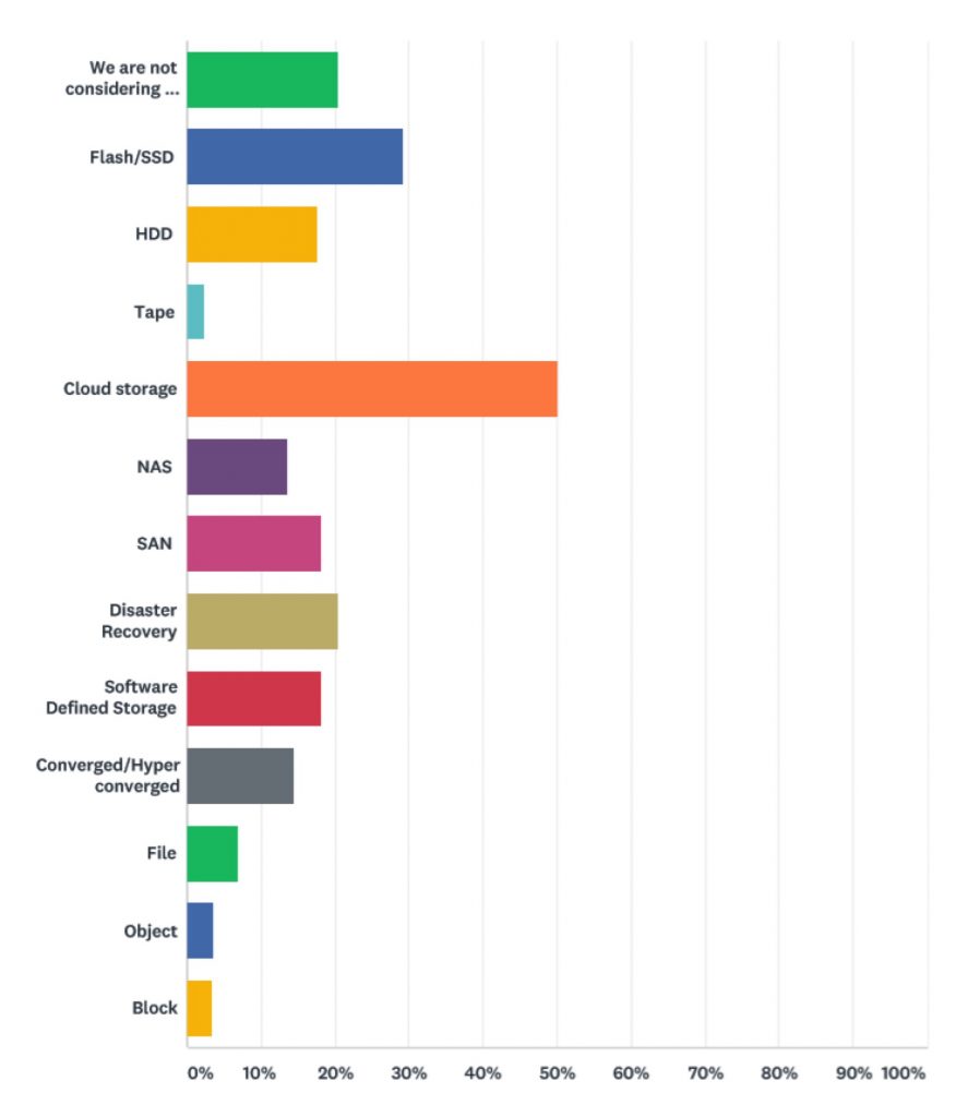 • At 50%, cloud storage is far and away the major planned purchase. More companies are relatively confident about security in the cloud and tend to trust the major providers. And because most providers offer free ingress and inexpensive per-gigabyte pricing for storage under a certain threshold, entry costs are low.