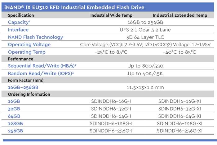 Built on the company’s 3D NAND architecture, the iNAND IX EU312 UFS EFD brings UFS speeds combined with industrial grade high endurance and capacities to cameras and smart video applications at the edge. This device delivers read speeds of up to 750MB/s (1) and write speeds of up to 320MB/s (1), which support read- and write-intensive use cases,