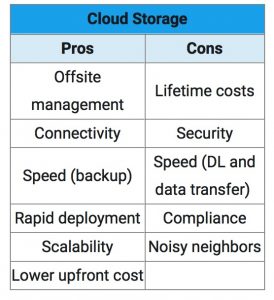 In brief, the pros of cloud storage revolve around scalablity, the value of offsite management, fast deployment, and lower upfront costs. Plus: in a world that always requires more – and more – storage capacity, cloud storage offers limitless additional capacity.