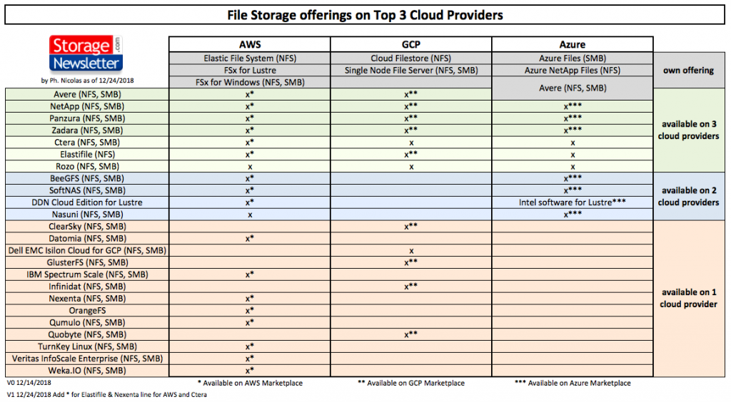 The only official vendors available on the 3 cloud providers with marketplace presence are: Avere (now Microsoft), NetApp, Panzura and Zadara. We invite the reader to pay attention to the various marketplace references.
