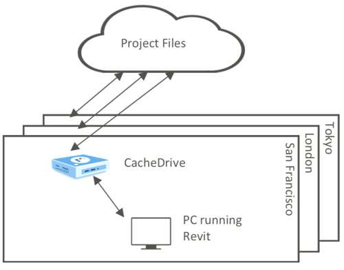 RTC for Revit enables a virtual Revit team to work on the same project as if on a local network. Users can perform Sync-with-Central and reload latest operations across remote sites and CloudNAS handles the necessary file syncing and locking through its global file system. The project files are stored in the cloud and cached to the local CacheDrive gateways for performance.
