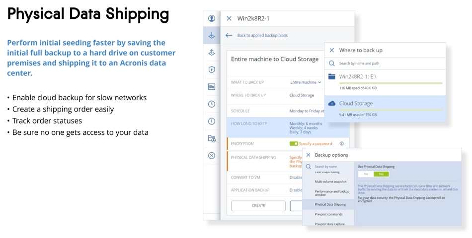 • Physical data shipping: Ability to protect large amounts of data by sending encrypted versions of full backups to a company’s data center on a HDD.