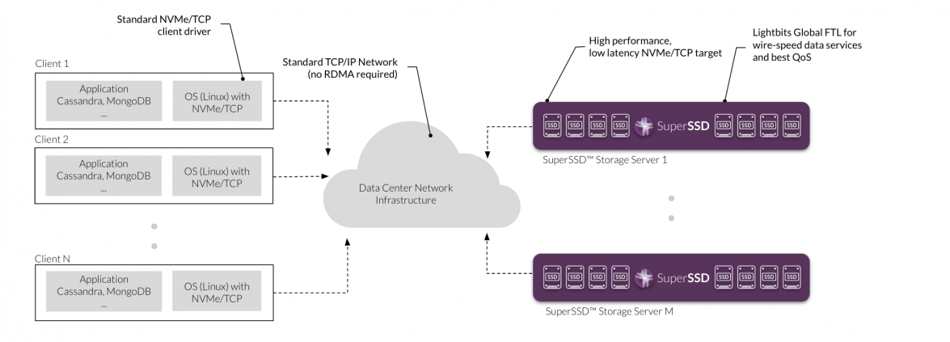 NVMe/TCP simplicity: Uses standard TCP/IP network infrastructure for shared storage supporting many applications and compute nodes.