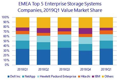 This is a Press Release edited by StorageNewsletter.com on June 17, 2019 at 2:22 pmThe EMEA external storage systems market recorded another, though milder, positive quarter in 1Q19, with 2.4% Y/Y growth in U.S. dollars (10.7% in euros), according to International Data Corporation‘s EMEA Quarterly Disk Storage Systems Tracker.