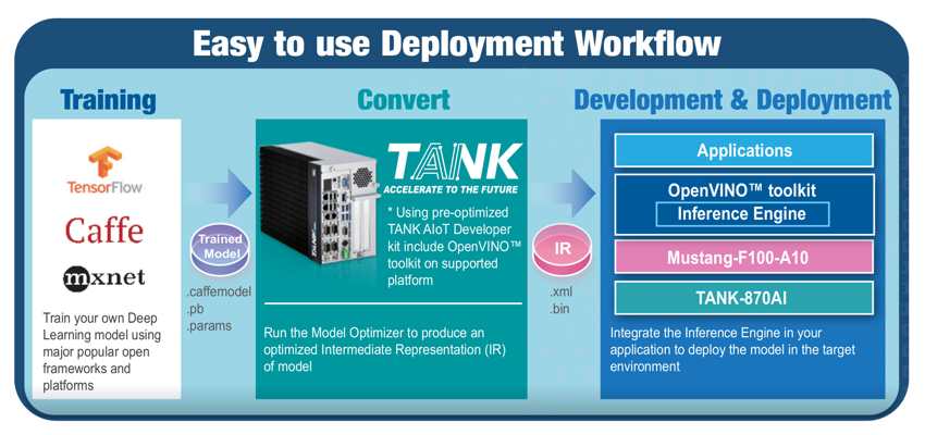 Both the Mustang-V100 and Mustang-F100 provide economical acceleration solutions for AI inference, and they can also work with the OpenVINO toolkit to optimize inference workloads for image classification and computer vision. The OpenVINO toolkit, developed by Intel Corp., helps to fast-track development of HPC vision and deep learning into vision applications. It includes the ‘Model Optimizer’ and ‘Inference Engine’, and can optimize pre-trained deep learning models (such as Caffe and TensorFlow) into an intermediate representation (IR), and then execute the inference engine across heterogeneous Intel hardware (such as CPU, GPU, FPGA and VPU).