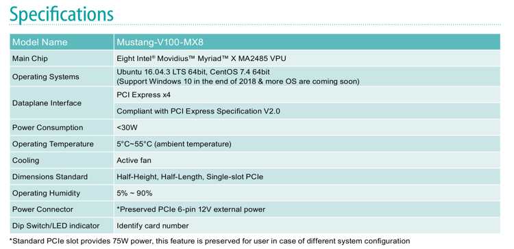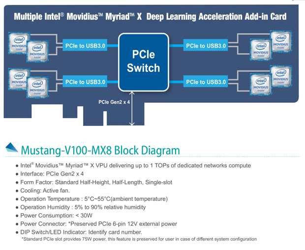 Half-height, 8 Intel Movidius Myriad X MA2485 VPU, PCIe Gen2 x4 interface, power consumption lower than 30W