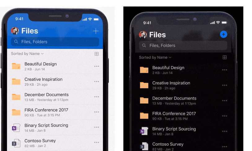 We’re also thrilled to announce that the OneDrive mobile app on iOS 13 now supports dark mode. This dramatic new look is both easy on the eyes and lets you take full advantage of an OLED screen to save battery life. To try it out, simply set your iOS 13 device to Dark Appearance in Settings > Display and Brightness and then open the OneDrive app.