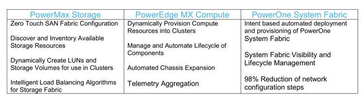 PowerOne integrates PowerEdge compute, PowerMax storage, PowerSwitch networking and VMware virtualization into a single system combined with a built-in intelligence engine to automate thousands of manual steps over its lifecycle. (1)
