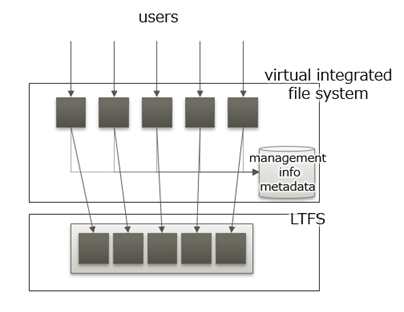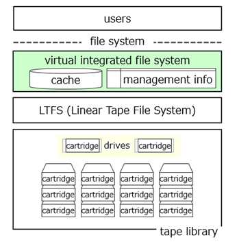 In general, to manage a large amount of data with magnetic tape storage, data is held under a different directory for each tape cartridge on LTFS, which uses multiple tape cartridges and can access data on a file-by-file basis in the same way as data on HDDs, USB memory, etc.