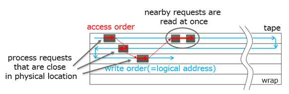 On a magnetic tape, data is divided along its length in units called wraps, and each wrap wraps around and is written in a write-once fashion. Therefore, the distance between the logical address and the physical address is very different. The virtual consolidated file system accepts multiple random read requests and processes them starting with the closest physical location on the tape, not the logical address.