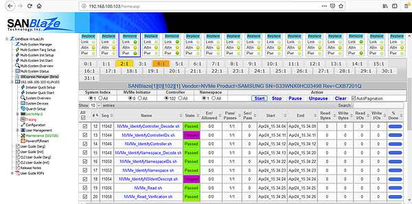 Version 8.0 introduces the ‘Certified by SANBlaze‘ (SBCert) test methodology and accompanying built-in scripts allowing the testing of all aspects of performance and compliance. Tests focused on exception testing, data integrity, and spec compliance are packaged with a simple GUI. An underlying API allows control of the automated test suite from your own test infrastructure. SBCert tests range from simple R/W to tests that exercise every aspect of NVMe architecture – from queue depth to Namespace Management, from SGL testing to device removal/insertion testing, and from signal glitching, power fault and margin testing to extensive reset testing.